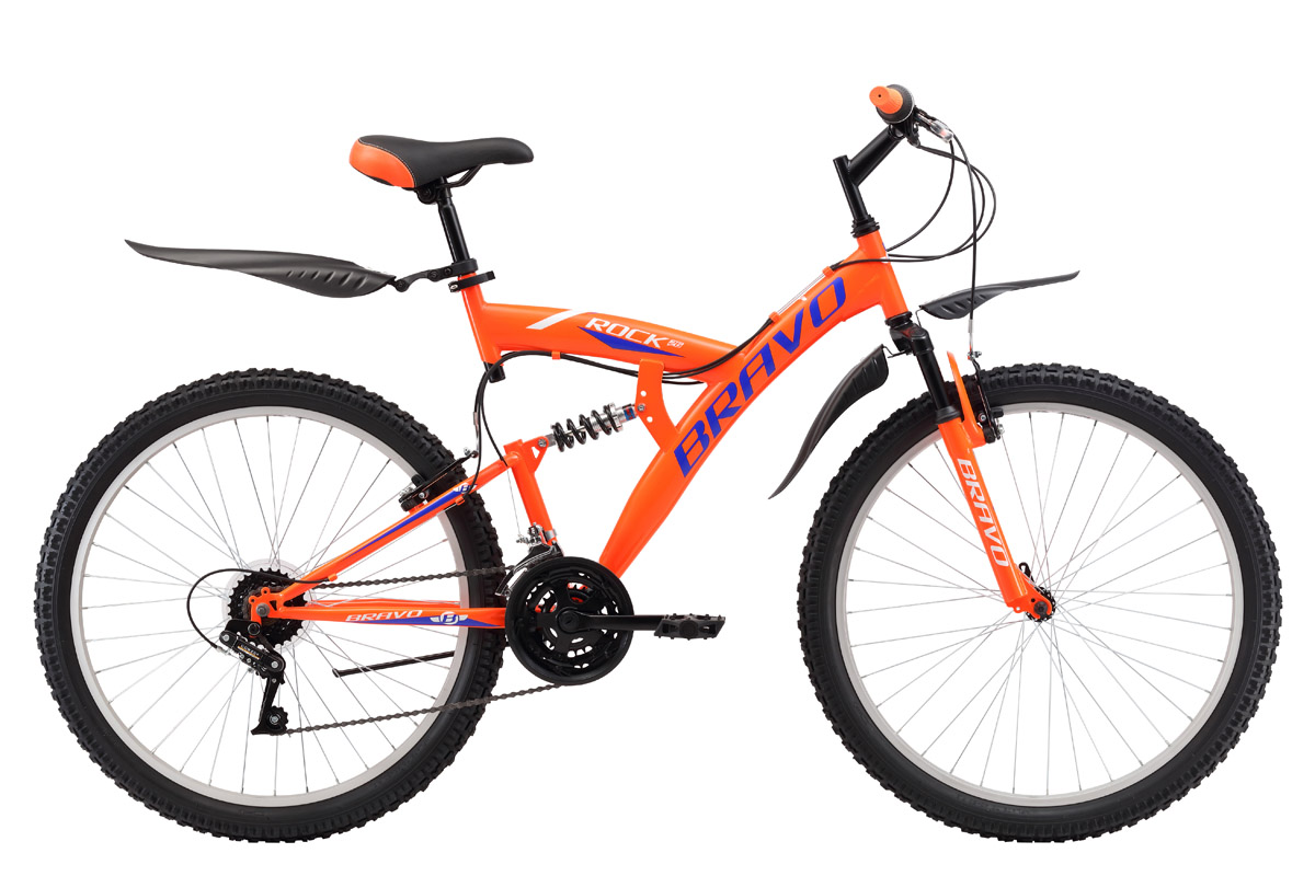 Велосипед двухподвес Bravo Rock 26 выполнен на стальной раме, и отлично подходит для езды по различным типам дорог. Трансмиссия велосипеда имеет 18 скоростей, что позволяет подобрать оптимальную нагрузку. Велосипед оснащён ободными тормозами, надёжными и простыми в эксплуатации. Переднее колесо крепится к вилке эксцентриком, что позволяет быстро снять его, при погрузке велосипеда в автомобиль. В комплекте с велосипедом Bravo Rock 26 идут крылья и подножка.